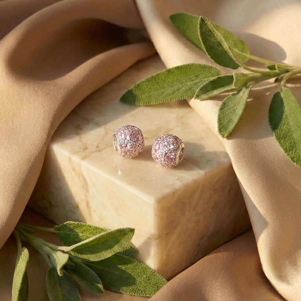 Detalle: Charms Esféricos con Diseño Pavé e Incrustaciones de Zirconias en Tonos Rosa & Blanco