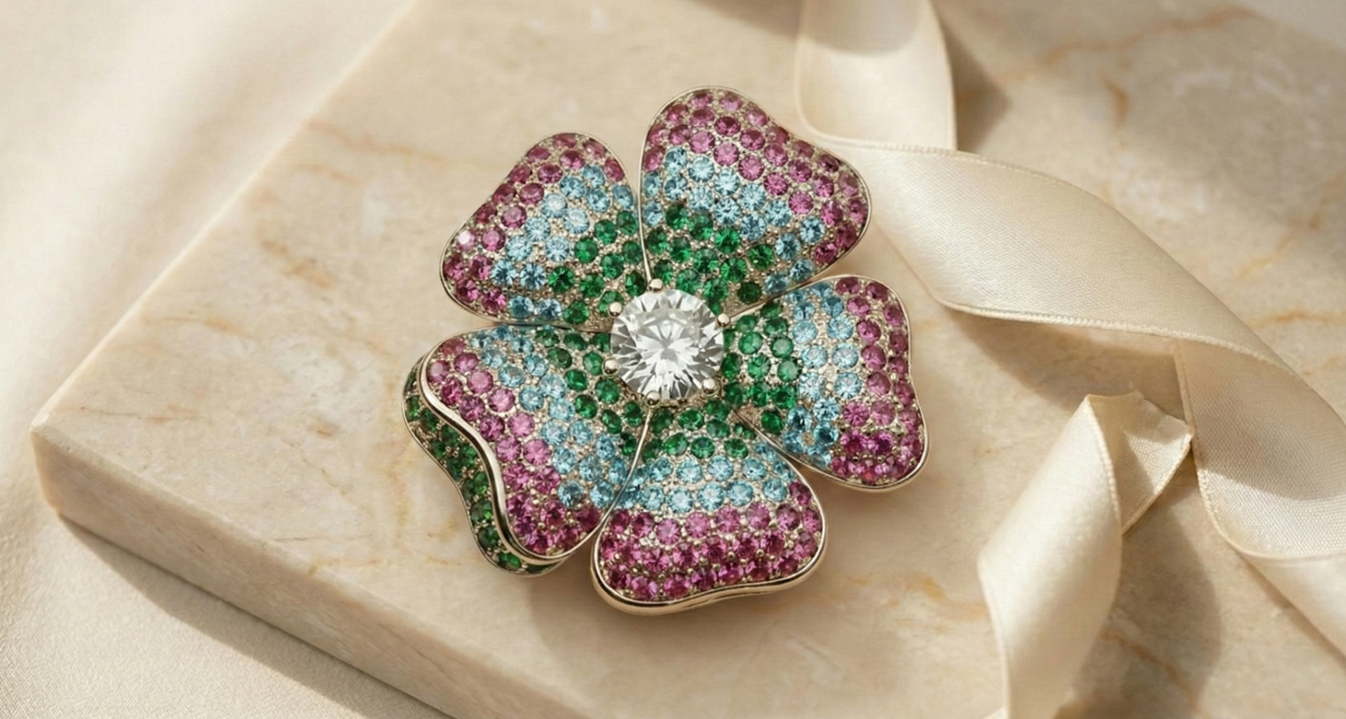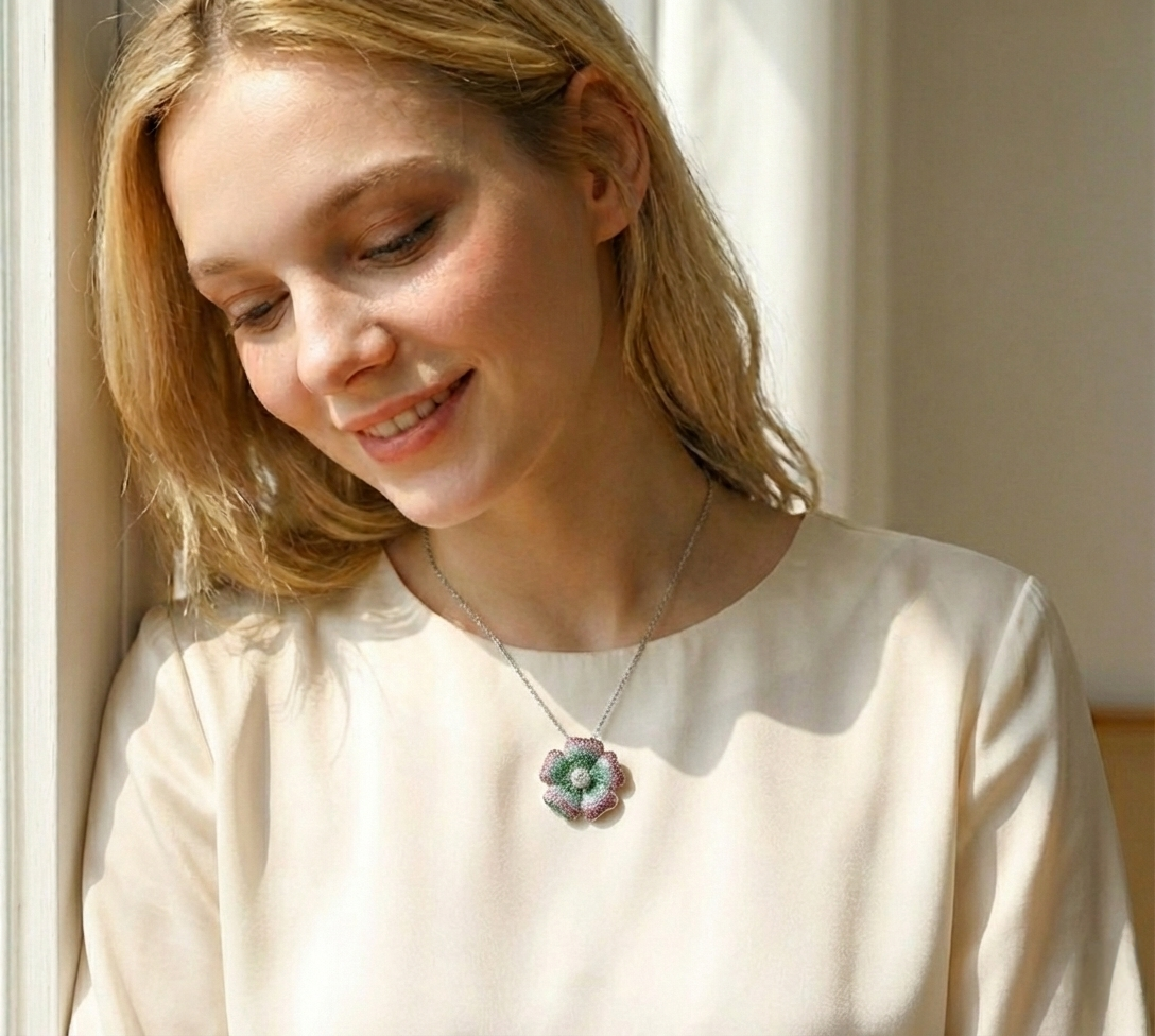 Una joya, infinitas posibilidades. Esta pieza de Plata Italiana 925 es una celebración de la naturaleza y el color. Su diseño de doble función (úsalo como broche o dije) presenta una flor escultural cubierta por un micro-pavé en degradé: desde el verde esmeralda en el centro, pasando por azul aguamarina, hasta culminar en un rosa magenta vibrante. Todo gira alrededor de una zirconia central de talla facetada que ilumina la pieza con elegancia absoluta.