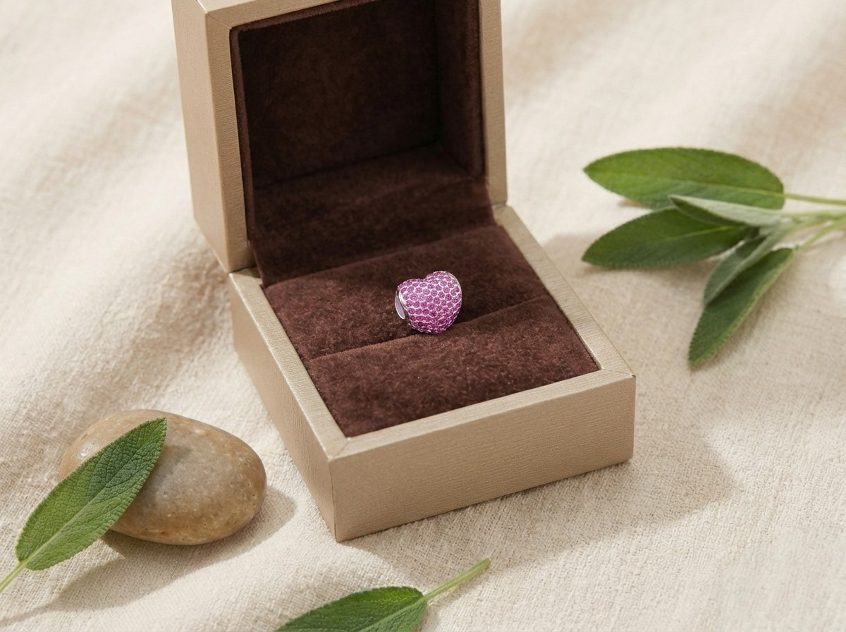 Un destello de amor vibrante. Elaborado en auténtica Plata Italiana 925, este diseño captura la esencia del romance moderno. Su superficie volumétrica está recubierta magistralmente con un micro-pavé de zirconias en tono rosa intenso, creando una textura radiante que atrapa la luz desde cualquier ángulo.