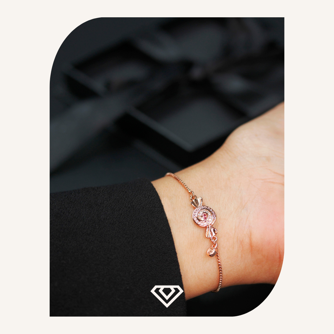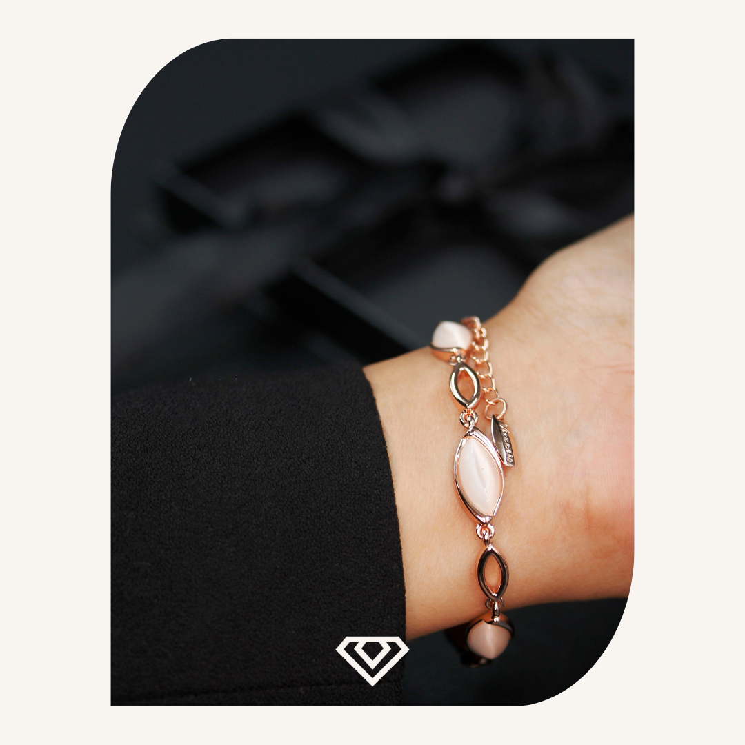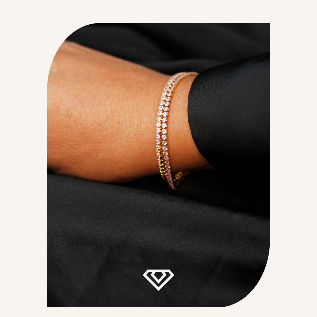 Pulsos con destellos rosa, delicado baño oro rosa.